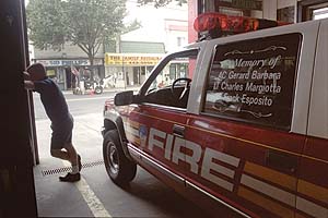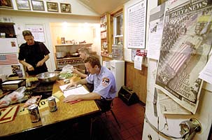 It is another sunny July afternoon in the Williamsburg section of Brooklyn, and at the quarters of Engine 216/Ladder 108 it’s mealtime again as heaping plates of pasta are passed around. The ever-present silent ballgame is on the TV as Housewatch calls the meal over the firehouse p.a. system: “Chow’s on! Chow’s on!” As we take our places around the table amid scraping chairs and clattering silverware, we are joined by two unfamiliar faces: a young girl in her 30’s and an older, middle-aged gentleman who are both dressed in civilian clothes. I lean that they are both counselors, assigned to spend two days a week at 216/108 as part of Project Liberty, a FEMA-sponsored project that is working to help make counseling services available to the firefighters if they should need them. Their role at the firehouse is somewhat passive: aside from a short daily discussion of different topics relating to psychology and mental health, their job is to just “hang out” at the firehouse and make themselves available should someone wish to talk.