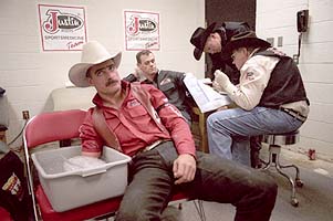 Professional Bullrider Rob Bell of Alberta, Canada is having a bad week. Ranked 7th in the world, he was unable to stay on for his first two rides, and then last night he was disqualified for accidentally touching the bull with his “free” hand during his ride – a violation of the “free hand rule”. What makes it all worse is that he’s sore, nursing a bruised arm. He sits on a treatment table, his back to the wall, his eyes and thoughts focused on something far away.