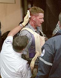 The first event of the evening is the Bareback Riding competition, and it isn’t long before there is the first casualty: 13th-ranked cowboy Kelly Wardell of Bellevue, Idaho gets tossed like a salad off of Rafter G’s “Durango”, and as he hits the dirt one of the horse’s hooves lands on his right forearm. Luckily for Kelly it doesn’t break, but just as luckily the Justin Sportsmedicine Team is right there with him to quickly lead him off to the nearby Training Room for some treatment.